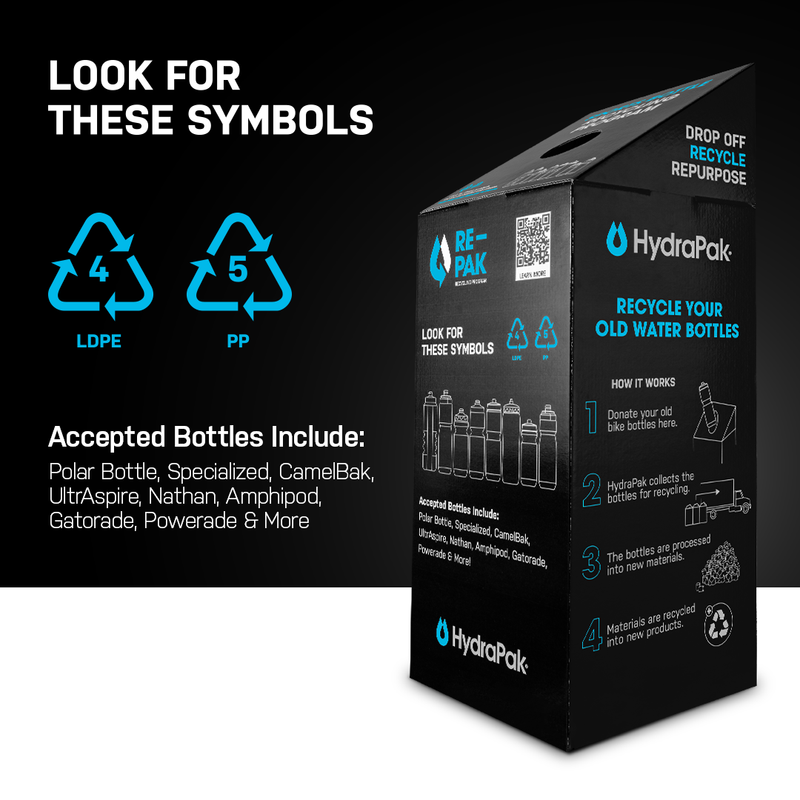 HydraPak's innovative upcycling program is dedicated to transforming old bottles into durable composite construction materials with a lifespan of over 30 years! Drop off your bottles in the Re_Pak Box. All squeezable LDPE and PP sports bottles are eligible, including Polar Bottle, Specialized, CamelBak, UltraAspire, Nathan, Amphipod, Gatorade, and Powerade.