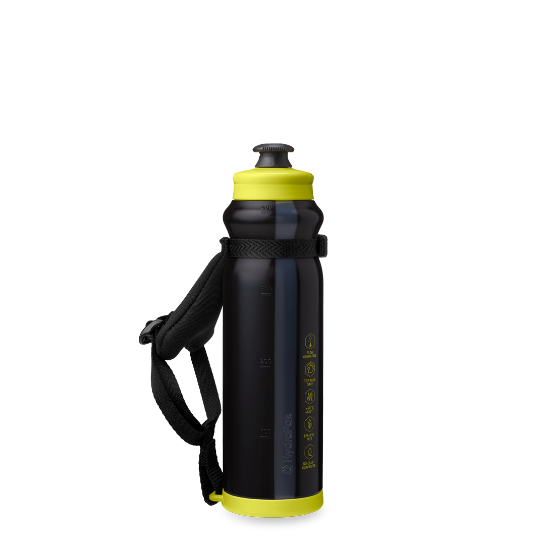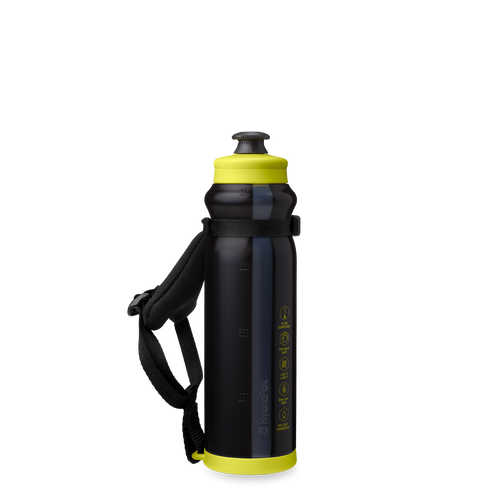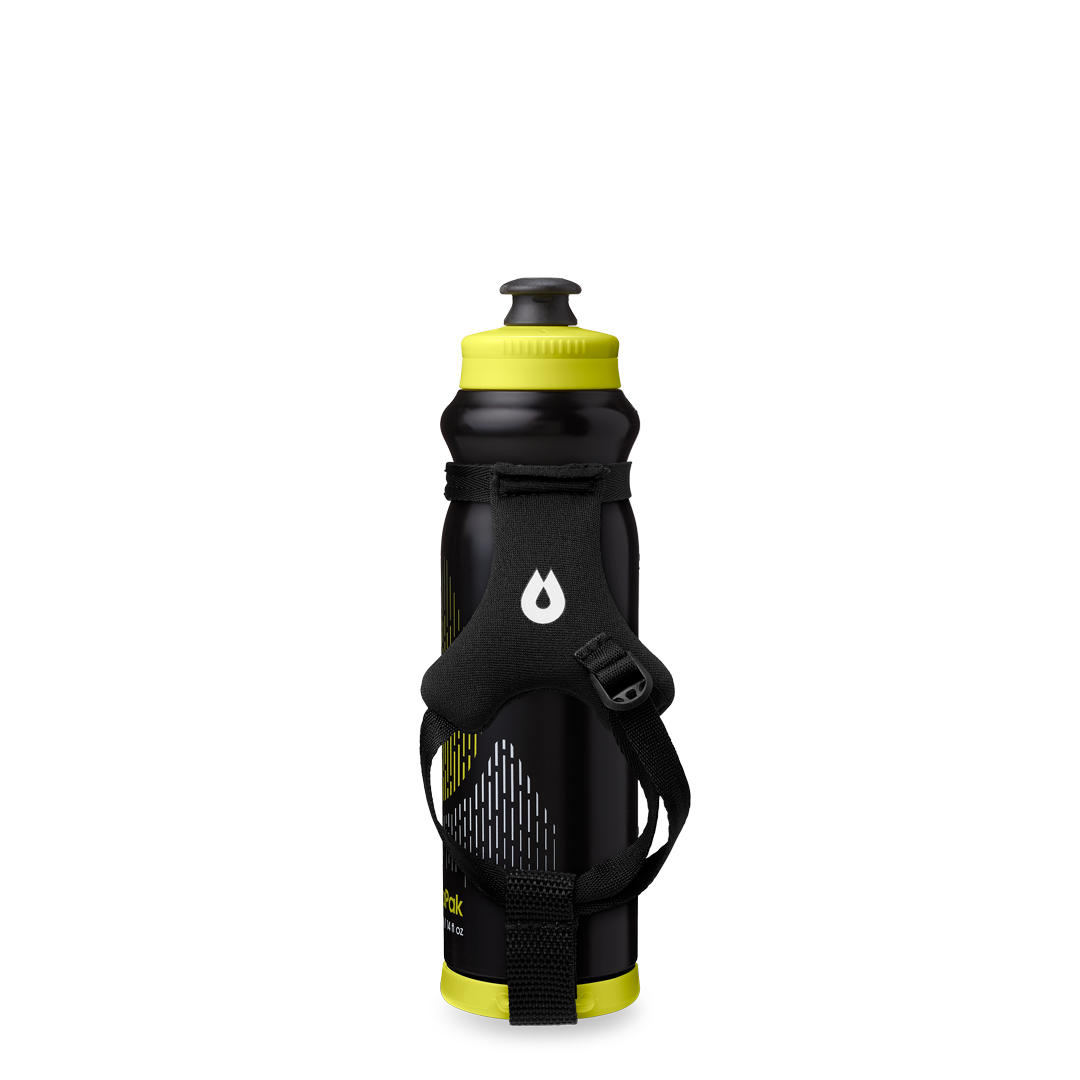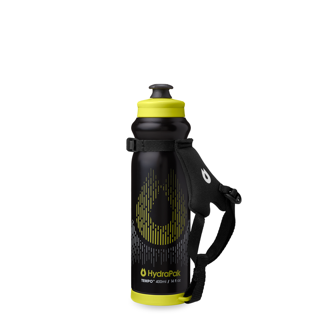 Clip the strap to your Tempo Bottle, pop on the bottom ring attachment, then pull the webbing straps to dial in the fit — left hand or right — for comfort on the move.