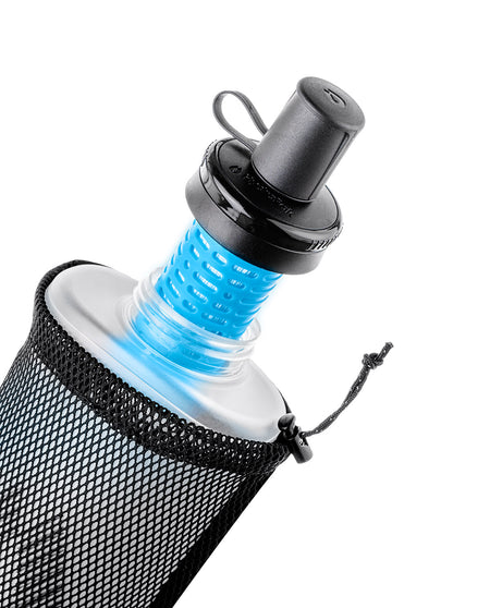 Carry less water and filter on the fly. Building on the innovative PackFlask™ design, this enhanced system features an integrated filter for fast, reliable hydration on the trail. Simply find a water source, fill and drink directly through the high-flow, self-sealing nozzle. The filter screws securely onto the flask, doubling as a squeeze filter for filling bottles or pots at camp. The stretch-mesh pouch securely attaches to your pack harness for hands-free use.