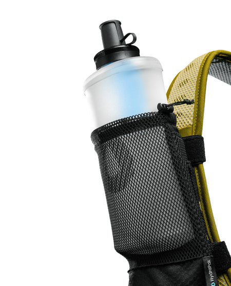 Stretch mesh pouch attaches to your pack harness and securely holds the bottle for hands-free hydration.